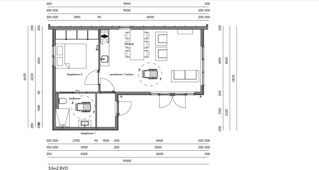 Deze basis mantelzorgwoning van De Linde heeft een totale lengte van 10.1 meter en een breedte van 4.3 meter. De totale hoogte van de mantelzorgwoning is 3.2 en heeft een totaal gewicht van 7000kg.